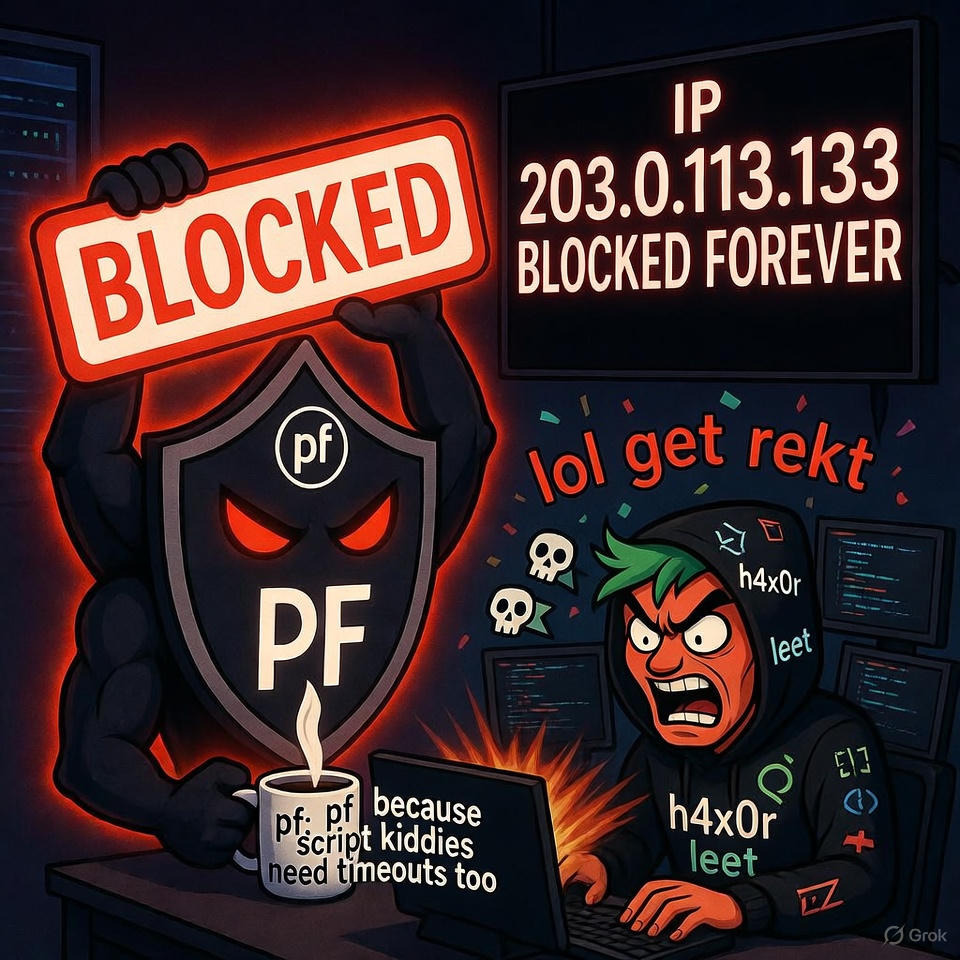 OpenBSD’s PF firewall is brilliant. Not only is it easy to configure with a straightforward syntax, but it’s easy to control on-the-fly.